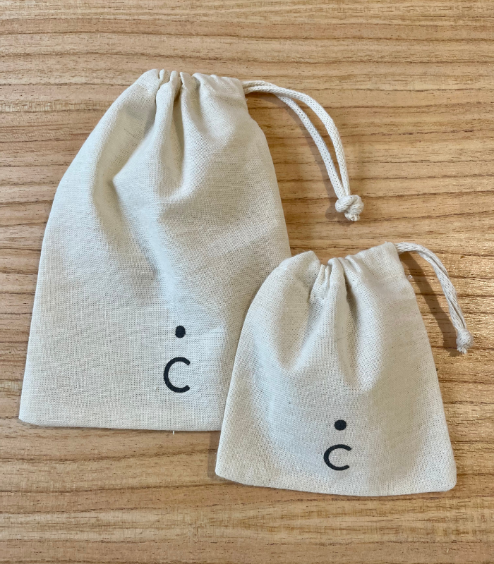 Bolsa confeccionada en lienzo de algodón, 10cm de ancho x 10cm de alto con frunce clásico lateral. Para el ajuste de la bolsa, podés seleccionar cordón de algodón ó cinta de raso color.