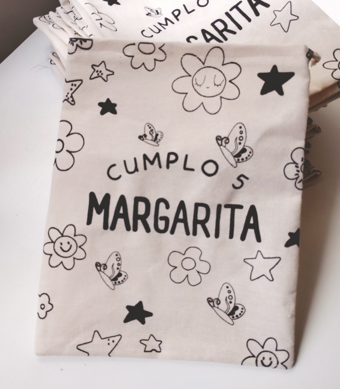 Bolsa confeccionada en lienzo de algodón, 20cm de ancho x 25cm de alto con frunce clásico. Para el ajuste de la bolsa, podés seleccionar cordón de algodón ó cinta de raso color, cierre simple (de un lado) o doble (ambos lados). Recordá aclarar el color de la cinta en notas del pedido al realizar la compra.