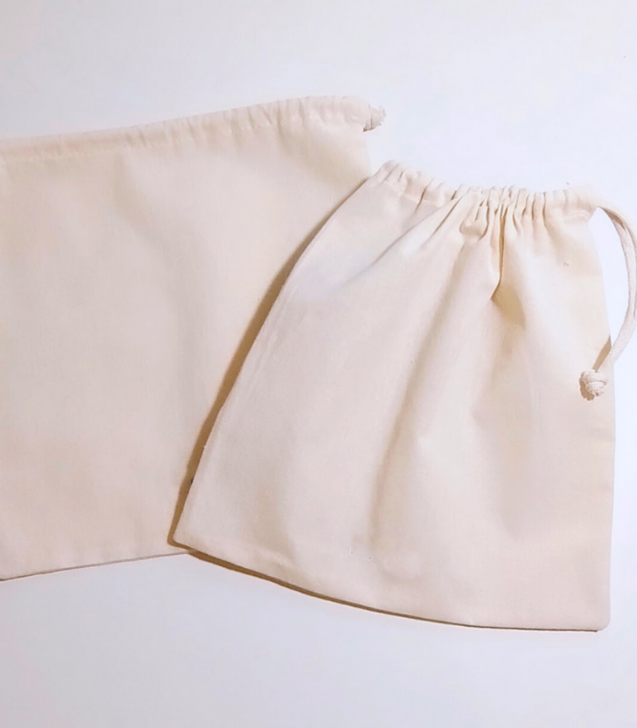 Bolsa confeccionada en lienzo de algodón, 20cm de ancho x 20cm de alto con frunce clásico SIMPLE. Para el ajuste de la bolsa, podés seleccionar cordón de algodón ó cinta de raso color. Recordá aclarar el color de la cinta en notas del pedido al realizar la compra.