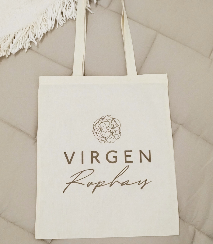 Bolsa de 35cm de ancho x 40cm de alto, con manijas de cinta hilera de 3cm ancho x 68cm de largo.