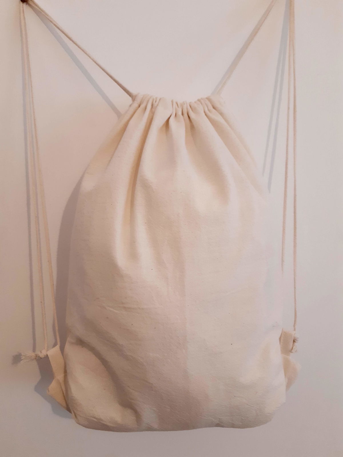 Mochila de lienzo de algodón crudo LISA de 35cm de ancho x 40cm de alto, con cierre frunce DOBLE con cordón de algodón de 6mm.